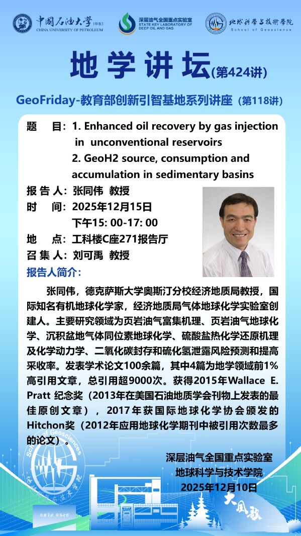 【地学讲坛第424讲】关于张同伟 教授 《Enhanced oil recovery by gas injection in unconventional reservoirs》和《GeoH2 source, consumption and accumulation in sedimentary basins 》两个学术报告的通知