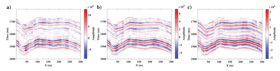 (a)小角度叠加地震数据;(b)中角度叠加地震数据;(c)大角度叠加地震数据