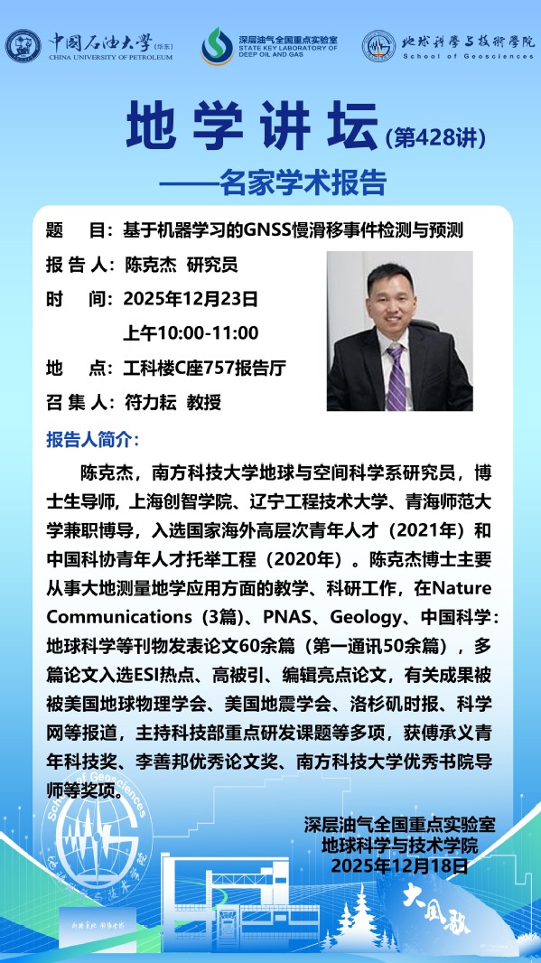 【地学讲坛第428讲】关于陈克杰研究员《基于机器学习的GNSS慢滑移事件检测与预测》学术报告的通知
