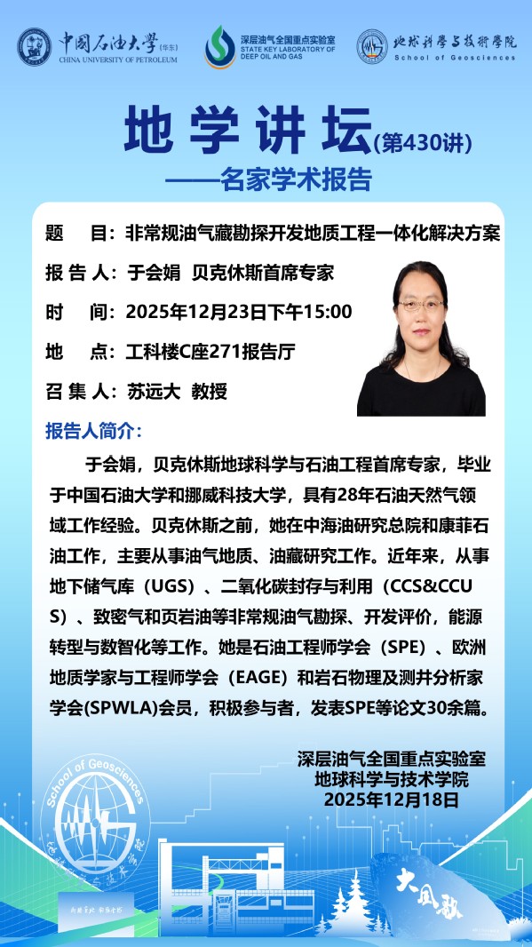 【地学讲坛第430讲】关于于会娟首席专家《非常规油气藏勘探开发地质工程一体化解决方案》学术报告的通知