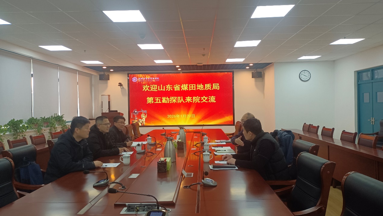 1月20日下午,山东省煤田地质局第五勘探队党委委员、副队长赵伟东、人事和离退休工作科科长孟国强和地质勘查事业部主任闫顺尚一行来院调研,学院副院长王健主持座谈会,学院副书记穆洋洋参会。王健副院长首先对第五勘探队一行来院交流表示欢迎,并向来宾介绍了学校和学院的历史发展、十四五以来取得的进展和未来规划。表示希望以这次面对面的交流为契机,进一步夯实双方合作的基础。赵伟东委员一行认真听取了学院介绍,对学院在人才和科研取得的成绩给予高度评价,指出学院专业设置和山东省煤田地质局及第五勘探队的科研方向高度契合,双方合作基础扎实、前景广阔。随后,赵伟东委员详细介绍了山东省煤田地质局的组织结构、发展历程、科研业务方向及服务国家能源资源安全、生态文明建设等方面的时间成果,重点分享了围绕国家战略需求,在省外煤炭区块勘探、金属非金属勘探、生态环境治理、防灾减灾、新型能源建设等领域转型发展取得的成效。闫顺尚主任进一步介绍了第五勘探队的科研布局和发展现状,孟国强科长则单位人才招聘政策和具体流程作了详细说明,并现场解答了学院有就业意向的研究生的提问。交流会上,双方还围绕未来科研合作、实验室共建、人才合作培养等方面进行了交流,一致表示将充分发挥各自优势,拓展合作领域、创新合作模式,共同为服务国家能源资源安全和区域经济社会高质量发展作出新的更大贡献。