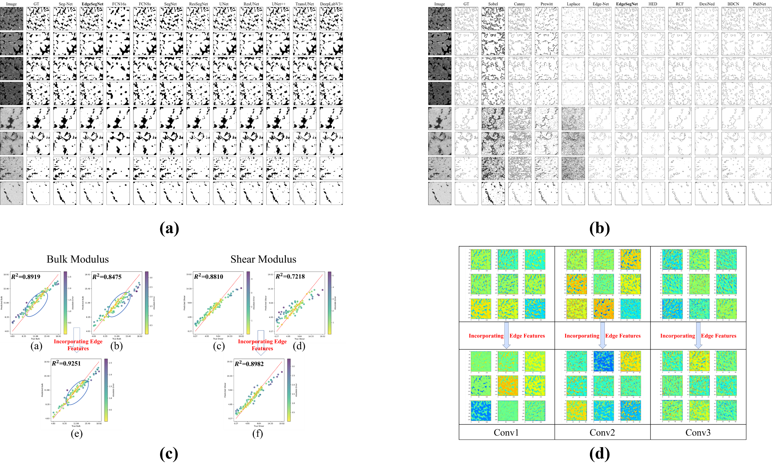 图2.实验结果:(a)分割结果对比可视化、(b)边缘检测结果对比、(c)力学性能预测结果对比、(d)地质信息融入可视化分析