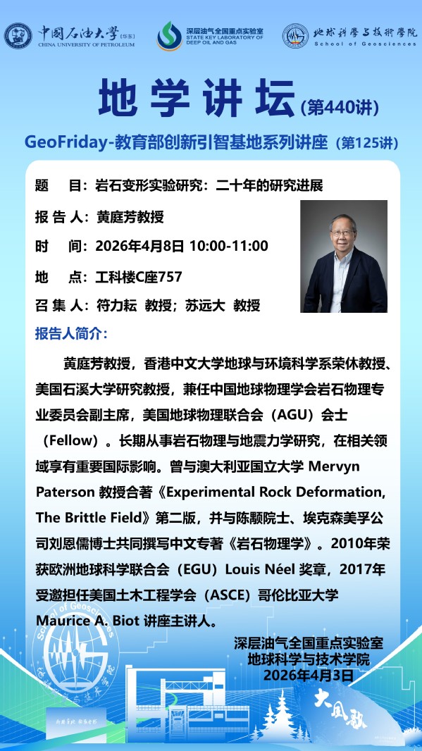 【地学讲坛第440讲】关于黄庭芳教授《岩石变形实验研究:二十年的研究进展》学术报告的通知