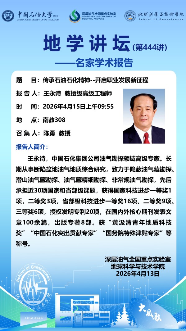 【地学讲坛第444讲】关于王永诗 教授级高级工程师《传承石油石化精神--开启职业发展新征程》学术报告的通知